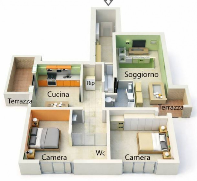 L'ingresso conduce alla zona giorno, composta da un luminoso soggiorno e una cucina abitabile con terrazza verandata, grazie alle ampie finestre gli ambienti risultano sempre ben illuminati e ventilati.